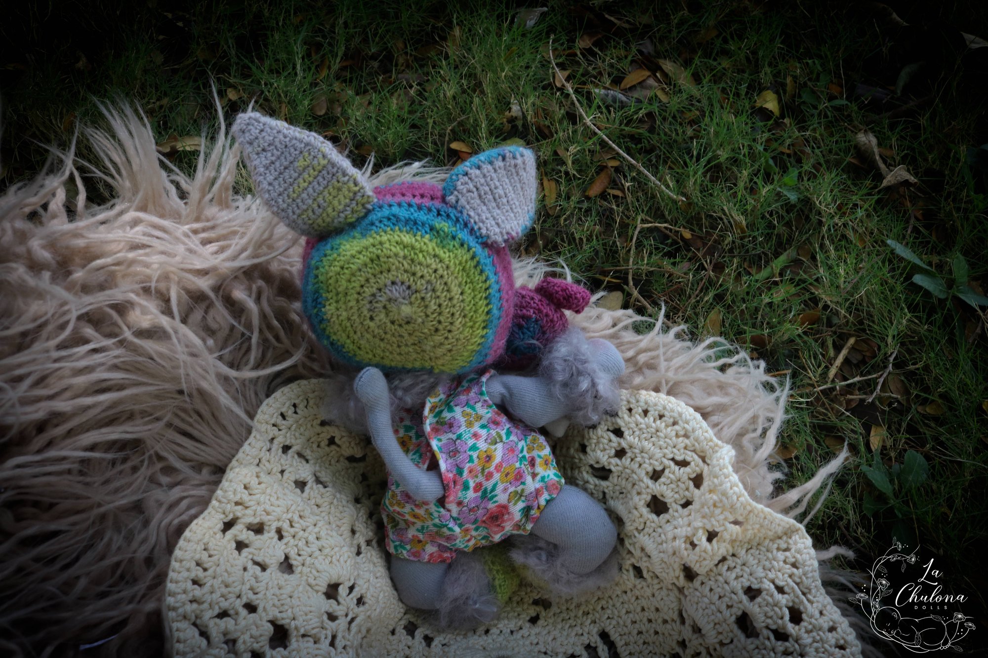 Handmade kitty lovie with crocheted bunny bonnet