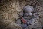 Tootles is an 8 inch natural fibers baby doll. Skin is DWE in a light brown color. Limbs and torso are firmly filled with clean wool. Head is floppy. Legs and arms are floppy on the shoulders and thighs. Arms are sewn directly to the torso three times for extra strength. Legs and torso are one piece. The head is firmly needle felted, soft sculpted on the mouth and eyes, and hand embroidered with DMC cotton embroidery floss. This doll is fully soft sculpted. His hair is a hand crocheted wig cap made out of a wool mix yarn. The wig has been hand sewn to his head. This hair doesn't need brushing. Ears are hand sewn to the head as well. Blushing was made with a red beeswax crayon and it is not permanent. You will get a little piece of cloth with some blush so you can retouch it if necessary.