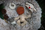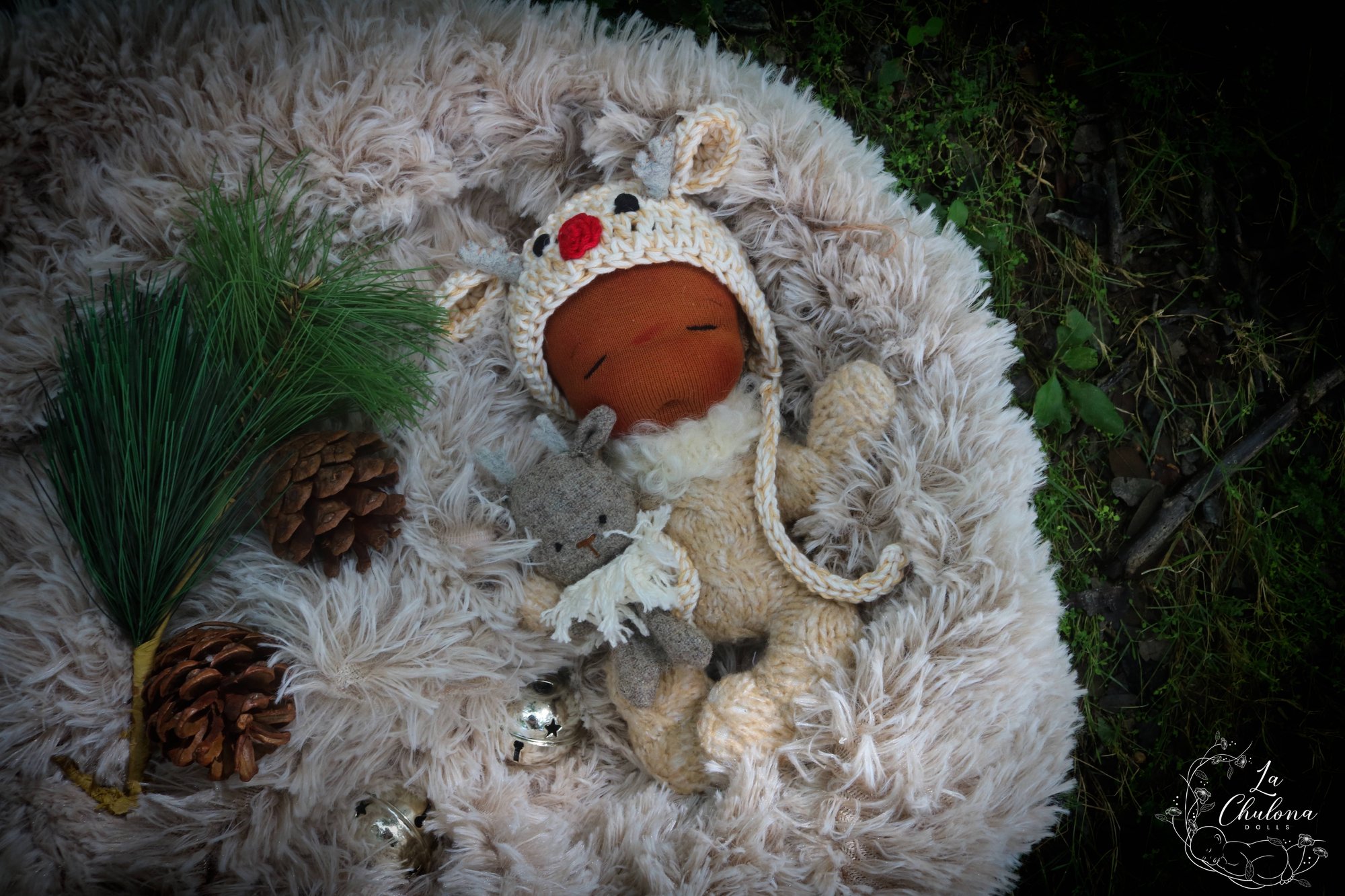 Rudy's skin is Heavy Weight Laib Yala in a red brown color. The body is made with an upcycle wool blend sweater and lined with cotton jersey fabric. This doll is filled with clean carded wool. The head is made in the traditional Waldorf style. This doll is not floppy like my other dolls. Body is one piece and head has been securely sewn to the body. Rudy's sleeping eyes have been hand embroidered with cotton DMC thread. His hair is made with brown cotton mix fleece. This Christmas cutie wears a mohair scarf with a button closure and a detachable hand crocheted cotton reindeer hat. Rudy will go home wrapped in a blanket and with his little reindeer baby doll.